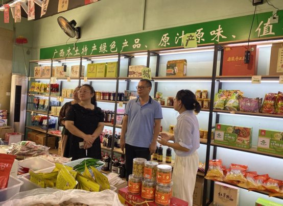 柳城县山哩里山农副产品经营部负责人向调研组推介特色农产品