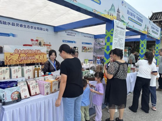 活动现场设置20余个融水展位,参展企业带来的各类特色农产品琳琅满目:紫黑香糯米、金边禾花鲤、手工红薯粉、大苗山红茶等依次陈列,充分展现融水农业的多元业态与丰收盛景。