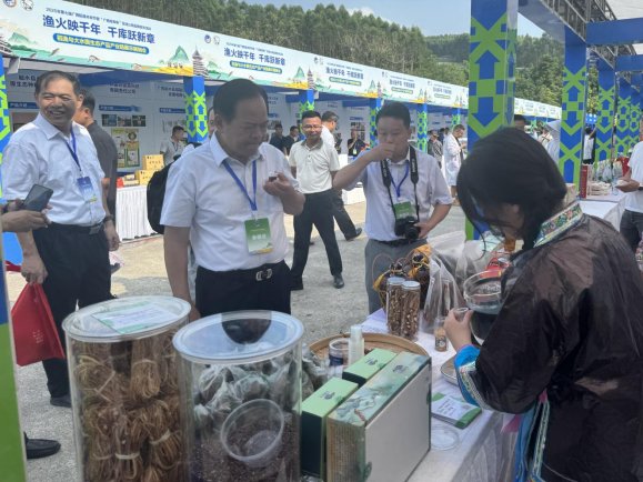 身着民族服饰的参展人员热情地向来自区内外的群众推介产品,“我们的产品都是本地生态原料制作,品质有保障!”融水县灵睿生态农业有限公司的工作人员一边介绍,一边邀请群众品尝特色糯米茶。展位上,从五谷杂粮到深加工特色农产品,涵盖20余种融水特色品类,吸引众多群众驻足咨询、选购。