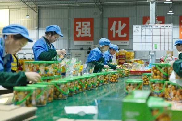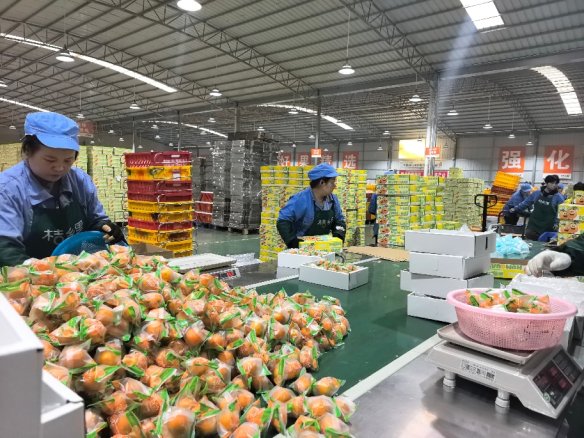 (中国融安金桔交易园内工人们忙着分拣、包装融安金桔)